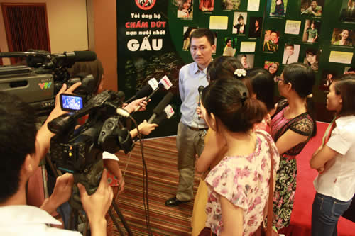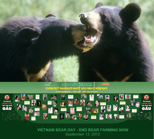 Vietnam Bear Day was held on September 13th, 2012, with celebrities My Linh and Minh Vuong speaking to journalists at a press conference in Hanoi about their desire to see an end to bear farming. ENV volunteers in seven major cities simultaneously hosted public awareness events, calling for an end to bear farming. Events were held in Ha Noi, Ha Long, Hai Phong, Vinh, Da Nang, Hue and Ho Chi Minh cities to focus public attention on the issue, and to encourage people not to consume bear bile or other bear products.
